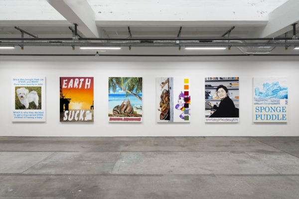I presented a group of six new oil paintings. This new series, titled A Brief History of Humanity and How It Will End, revolves around questions related to the notion of crisis. Based on digital collages, the works draw from an iconographic research into “poor images” — those from popular culture, advertising, Hollywood films, and memes — all these images that flood our perception and shape how we see the world, yet are almost instantly forgotten.